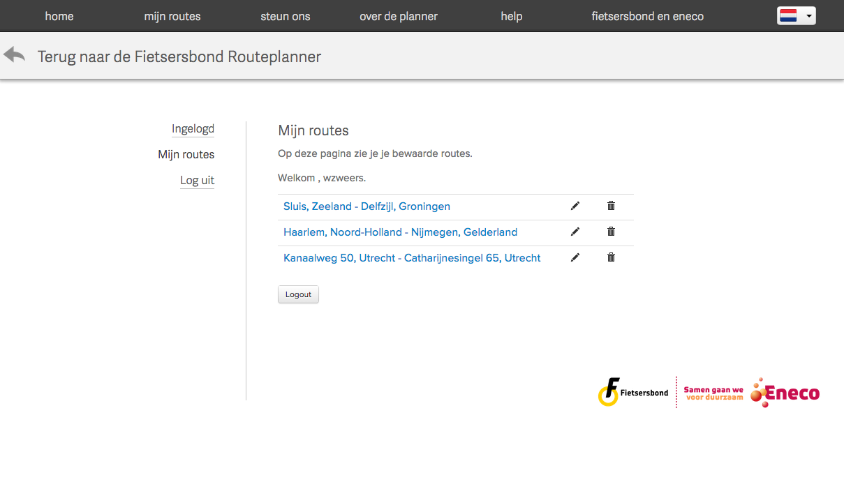 Je komt weer terug bij de Fietsersbond Routeplanner, met één subtiel verschil: in de bovenbalk is de keuze login / registreer vervangen door mijn routes.